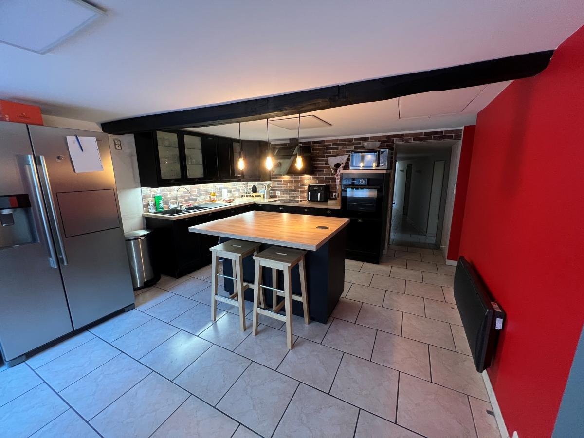 Au rez de chaussée: une cuisine équipée ouverte sur un salon séjour, un cellier, deux chambres, une buanderie et une salle de bain avec w-c.